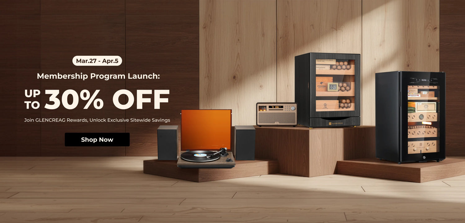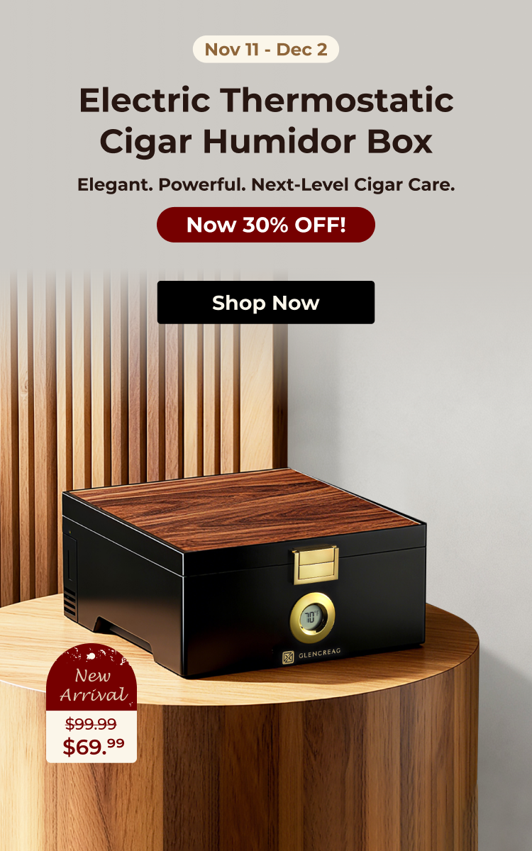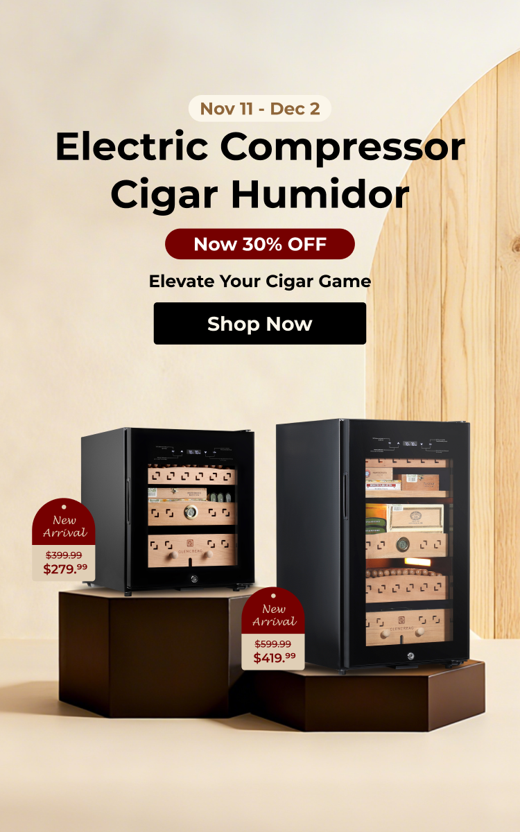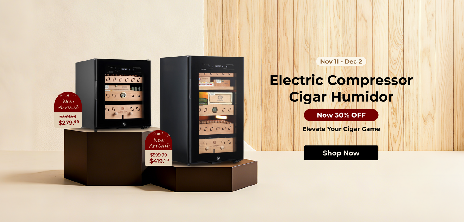 Available in 550 and 900-cigar capacities, the GLENCREAG Cigar Humidor Cabinet combines advanced compressor cooling, patented ammonia removal, and Spanish cedar drawers to keep cigars perfectly aged and flavorful.