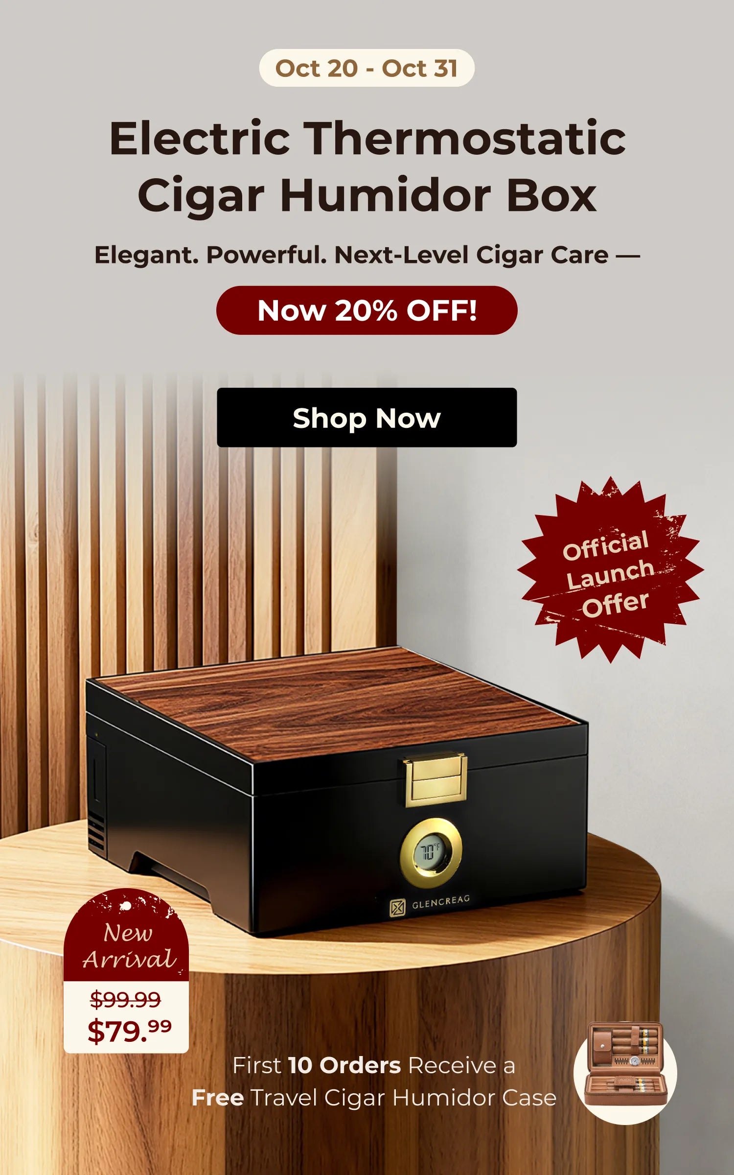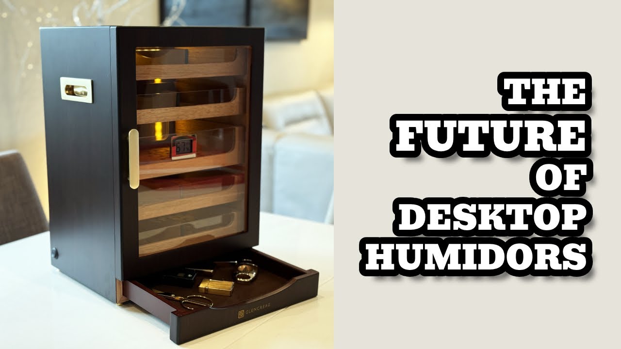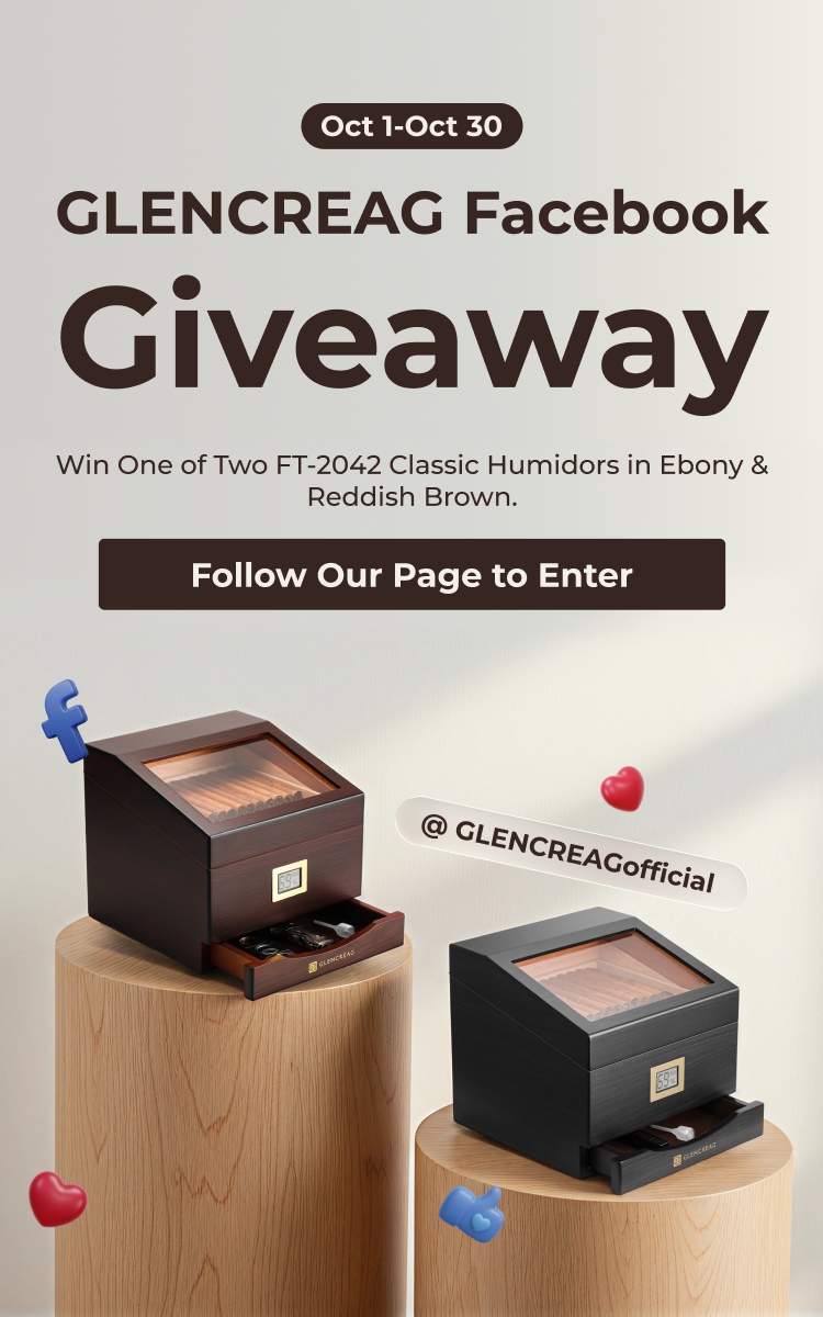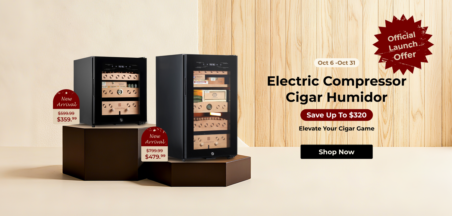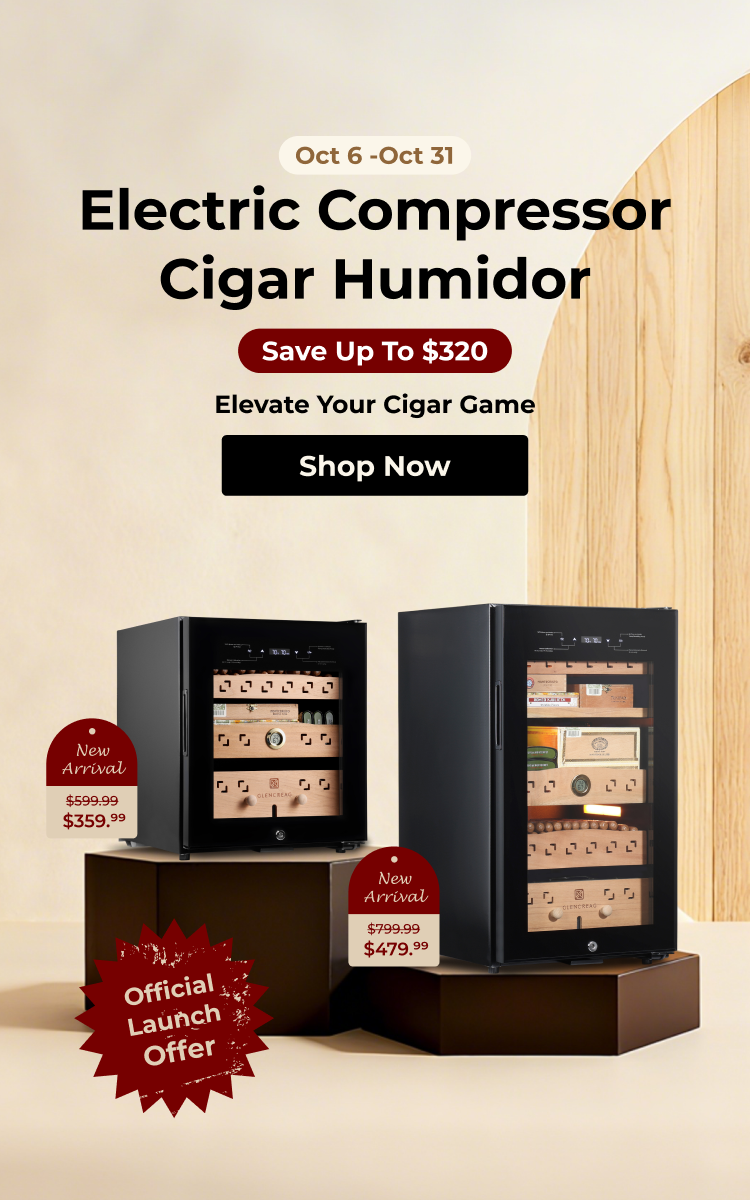 Available in 550 and 900-cigar capacities, the GLENCREAG Cigar Humidor Cabinet combines advanced compressor cooling, patented ammonia removal, and Spanish cedar drawers to keep cigars perfectly aged and flavorful.