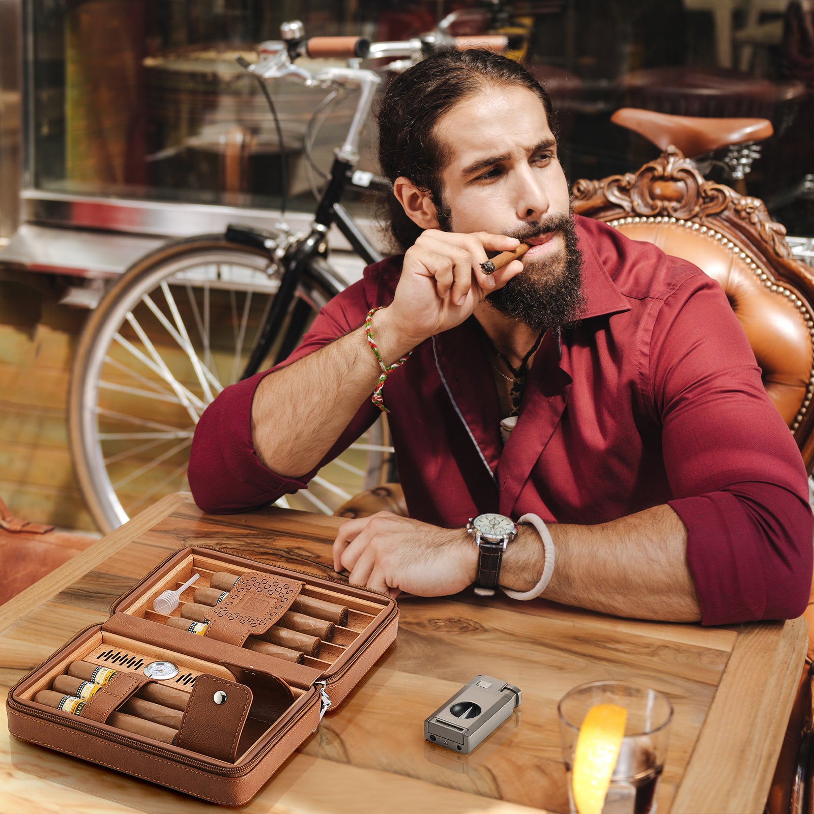 - Cigar Essentials Combo – A versatile torch lighter with built-in V-cutter and cigar punch for quick, efficient cigar preparation. Note: The lighter requires refilling for use.