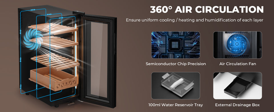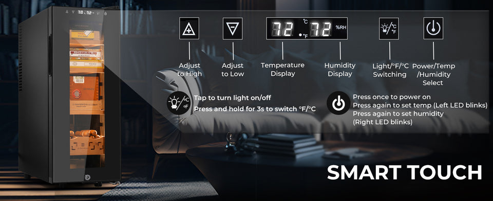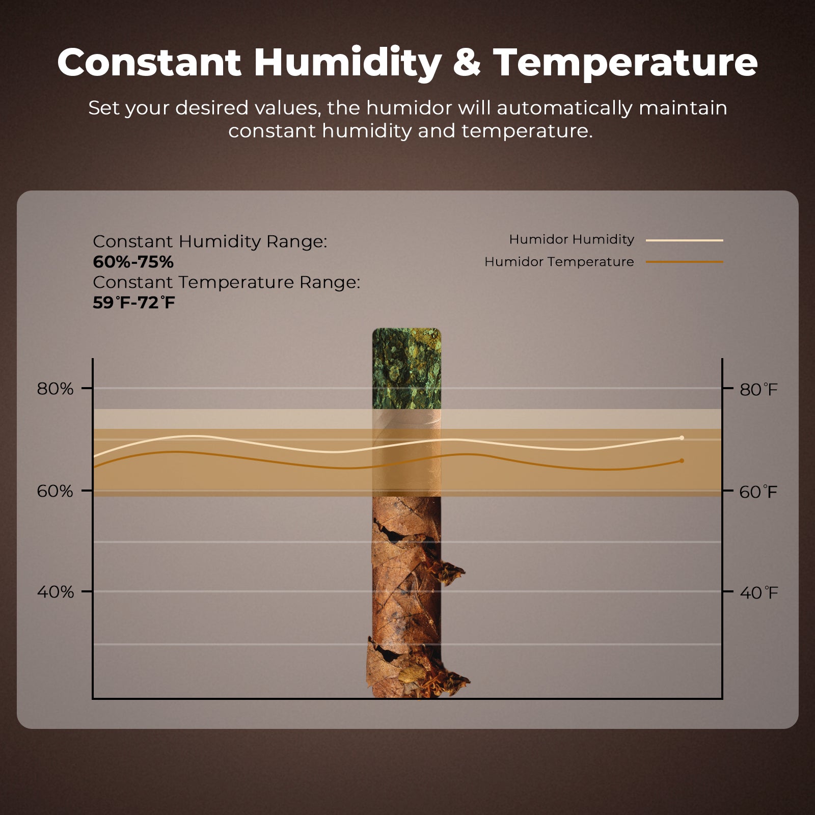 Once you set your preferred temperature and humidity, the humidor will reach these settings within 30–100 minutes, depending on the initial room conditions.