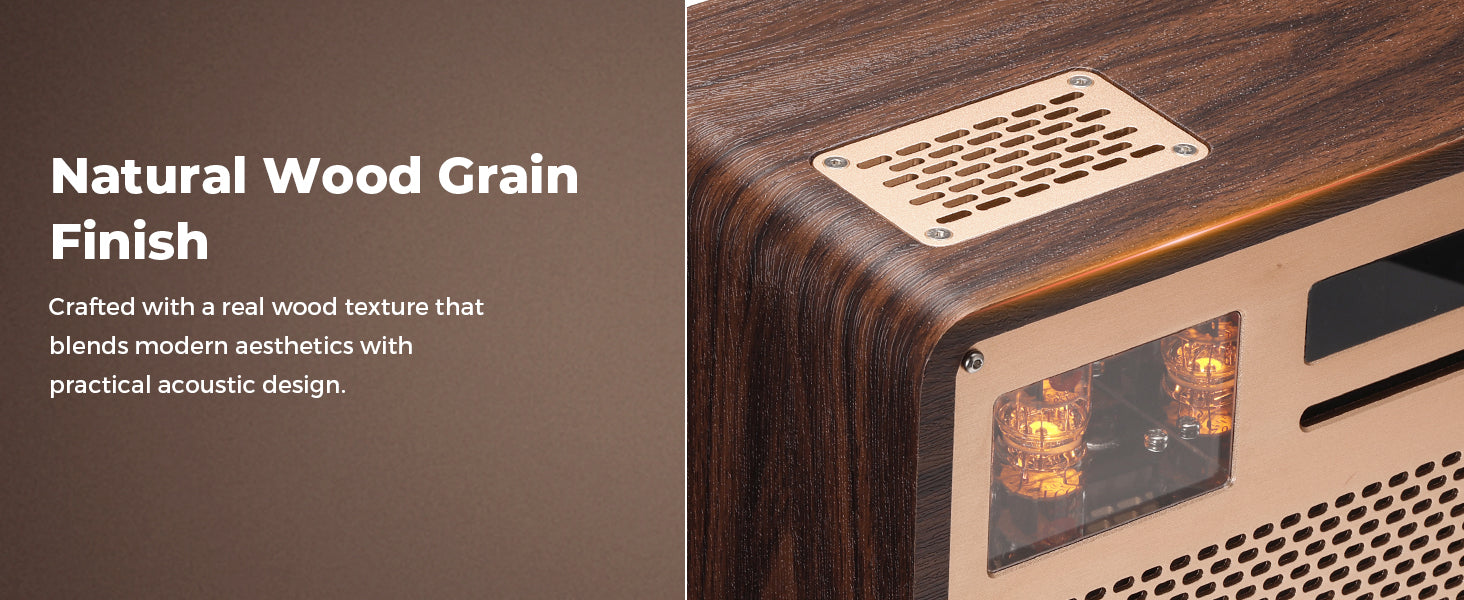 【Timeless Design Meets Modern Engineering】Front-tube & rear-stone configuration in a precision aluminum alloy panel with natural wood grain. A refined HiFi centerpiece that blends vintage aesthetics with modern functionality.